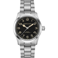 An iconic film favorite, the original Murph is now reimagined with a modern twist. Set on a black dial, the Khaki Field Murph's numerals are slightly domed, offering improved legibility, while the cathedral shaped hands give a vintage look to the timepiece. A piece for Hamilton and Hollywood enthusiats alike, the original 38mm version is now available on a brushed, three row metal bracelet